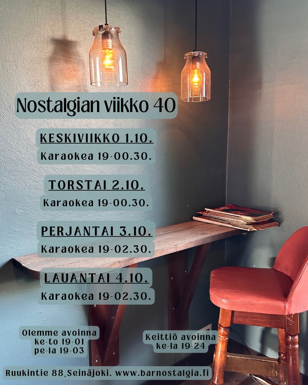 Idyllinen karaokeravintola Bar Nostalgia Seinäjoen Kivistössä on lämmin henkinen vapaa-ajan kohtaamispaikka. Karaokeharrastajien suosimalla esiintymislavallamme kaikki halukkaat saavat laulaa kannustavassa ilmapiirissä. Laadukas äänentoisto ja kattava yli 70.000 karaokekappaleen valikoimamme takaavat aina viihtyisän illan kivan lauluharrastuksen parissa.